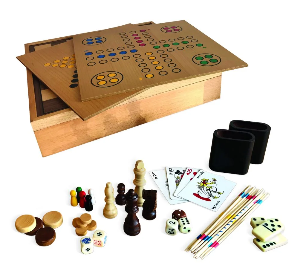 Chess Checker, Backgammon, Domino, Playing card, Poker dice, Mikado, Chinese Checker, Ludo, Solitaire.