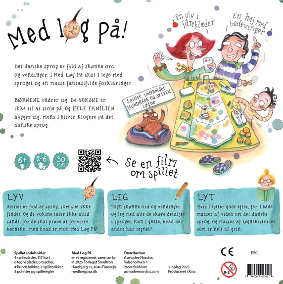 I Med Løg På skal I tegne og gætte skønne vendinger i det danske sprog… og nogle som de løgnagtige bedsteforældre Inge og Fernando har fundet på. Siger man ’Så er den ged barberet’ eller siger man ’Så er den hjort parkeret’? BØRNENE undrer sig. De VOKSNE er ikke til at stole på. Og HELE FAMILIEN hygger sig, mens I bliver klogere på, hvad der er Med Løg På!